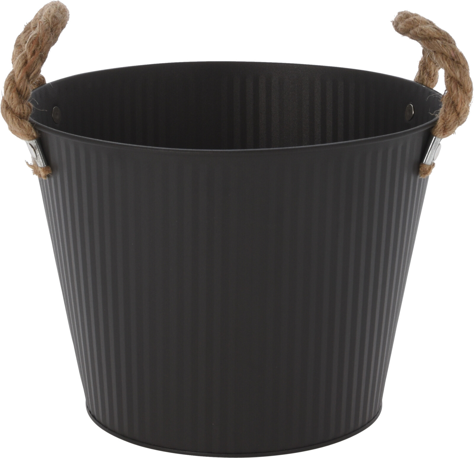 svart plåtkruka med jutehandtag - övre diameter cirka 23 cm - botten diameter cirka 16 cm - kantens höjd cirka 17 cm - ingen dräneringshål i botten