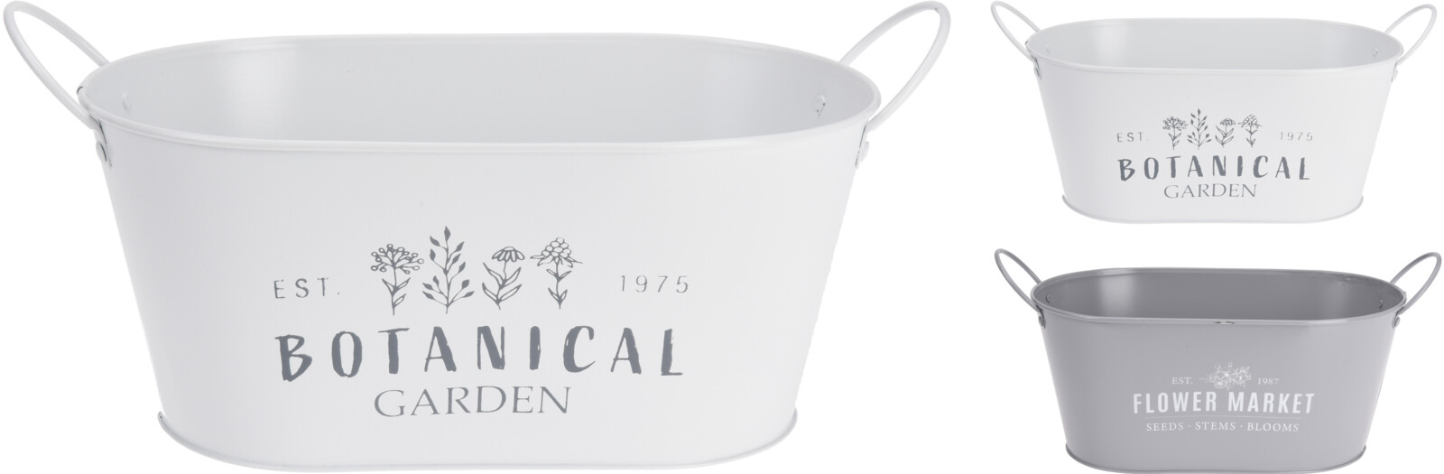 bred metallskyddsurna med handtag - höjd 12 cm - bredd 26 cm - djup 16 cm - finns i 2 olika: vit med texten "Botanical Garden" och grå med texten "Flower Market"