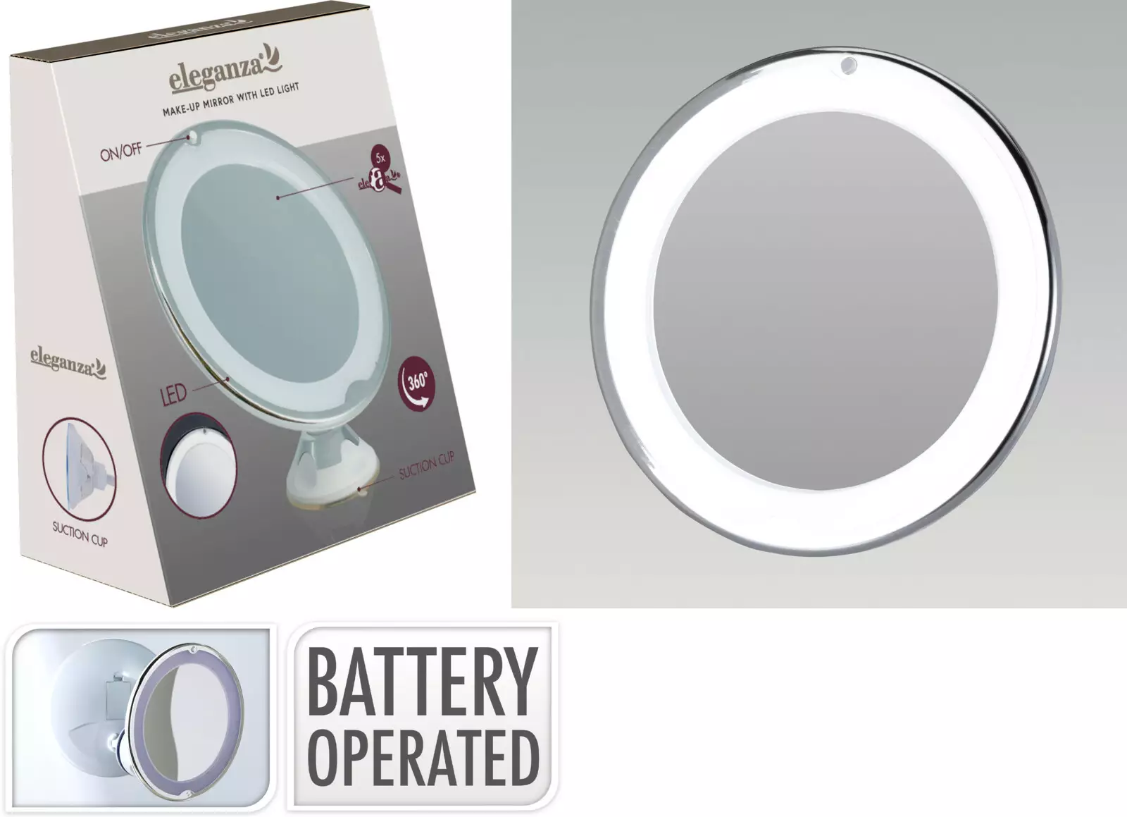 - Rund spegel med 5x förstoring och LED-belysning - Spegeln kan roteras 360 grader - Sugkopp på botten för stabil placering - Spegelns diameter är 20 cm - Belysningen drivs av batterier - Färg: vit - Material: plast - Strömbrytare för lampan - Spegeln har 5x förstoring
