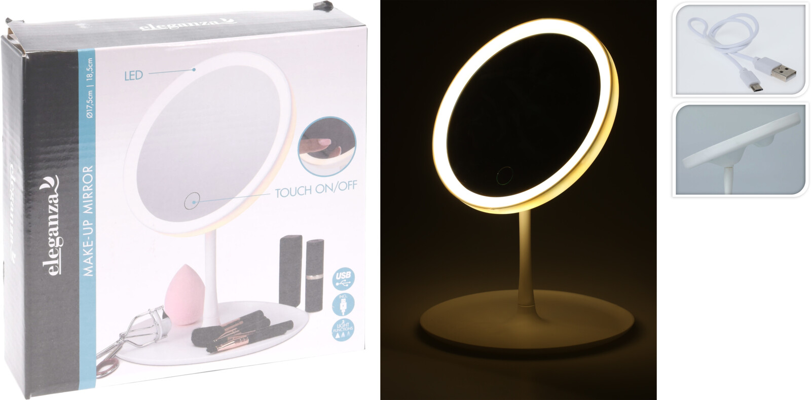 - USB-laddad belyst spegel, bordsmodell - Stativets diameter: 185mm - Spegelns diameter: 175mm - Höjd: 270mm