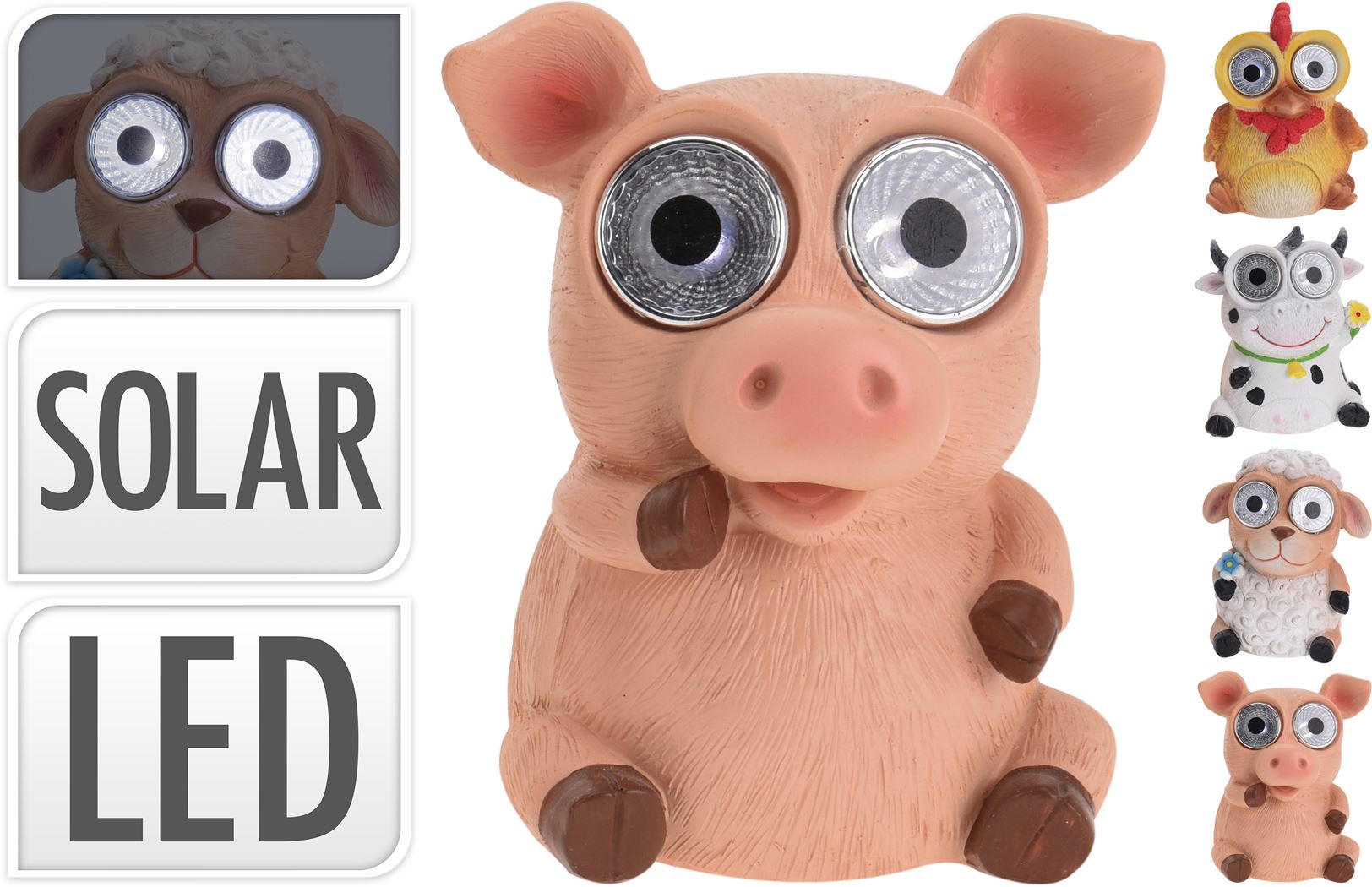 Liten dekorationsstaty med stora solcellslampögon - mått: 7x7x10 cm - vikt: 155 g - lamporna tänds när det mörknar och solcellen har laddat med solens strålar, lamporna släcks automatiskt när det blir ljust - 1,2V Ni-MH 40Ma batteri - CE och RoHS-godkännanden - för inomhus- eller utomhusbruk - tillgänglig i olika figurer (gris och ko slutsåld)