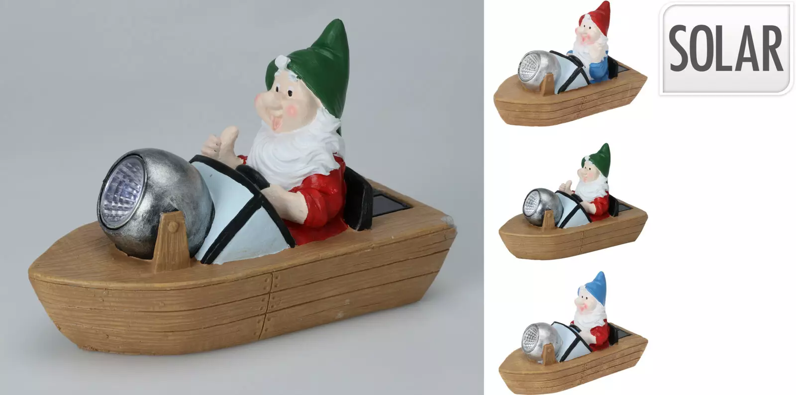 Trädgårdstomte med båt - storlek ca 20 x 13 cm - solcell laddar båtens strålkastare - blandad produkt: i blandningen finns 3 tomtar i något olika färger (se bild), du får någon av dem vid beställning.