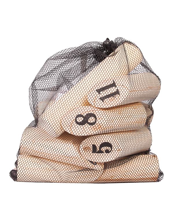 trä "möljky"-spel för alla åldrar - stugspel i nätpåse - i nätpåsen finns kastblock och nummerblock 1-12 - material: furu - blockstorlek 14,5x21 cm