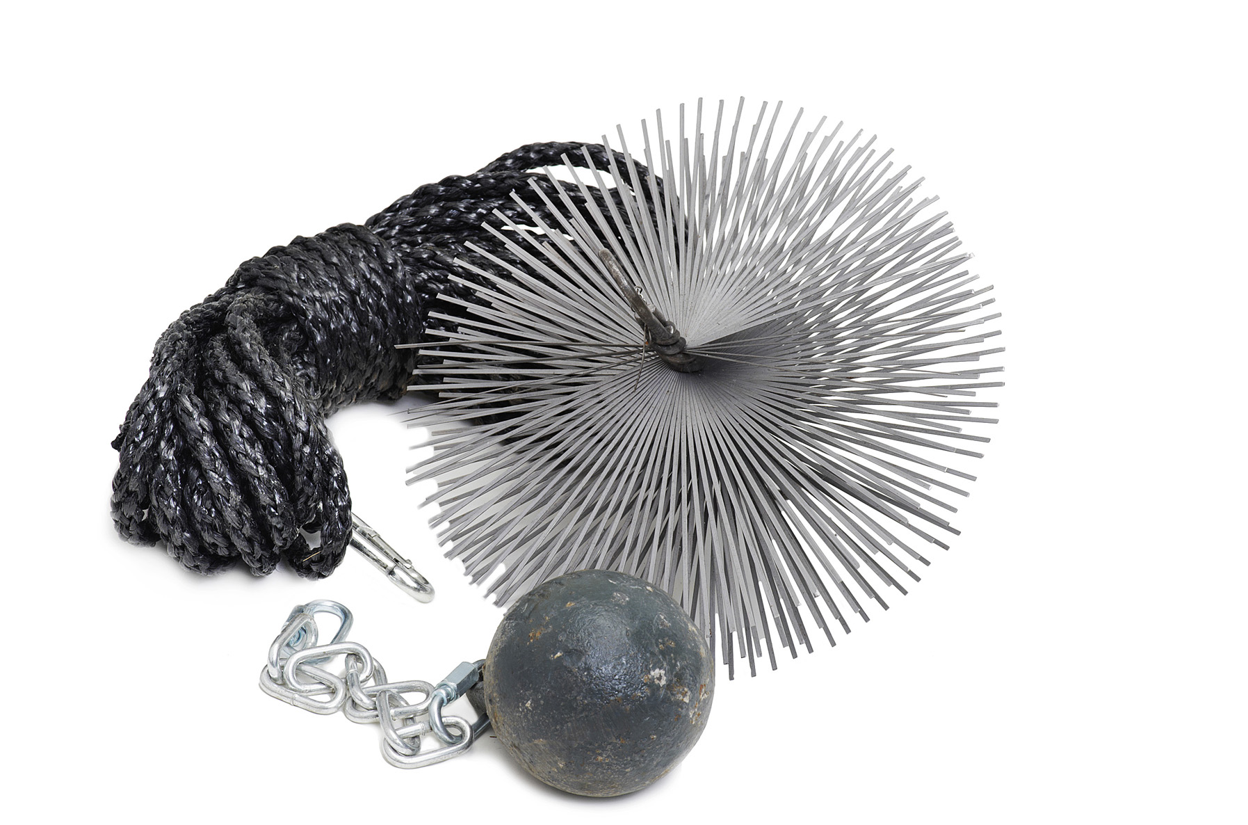 Tre-delat sotningsset, passar för tegelrör. - borste i stål (200mm) - kula (1,5kg) - snöre (10m)