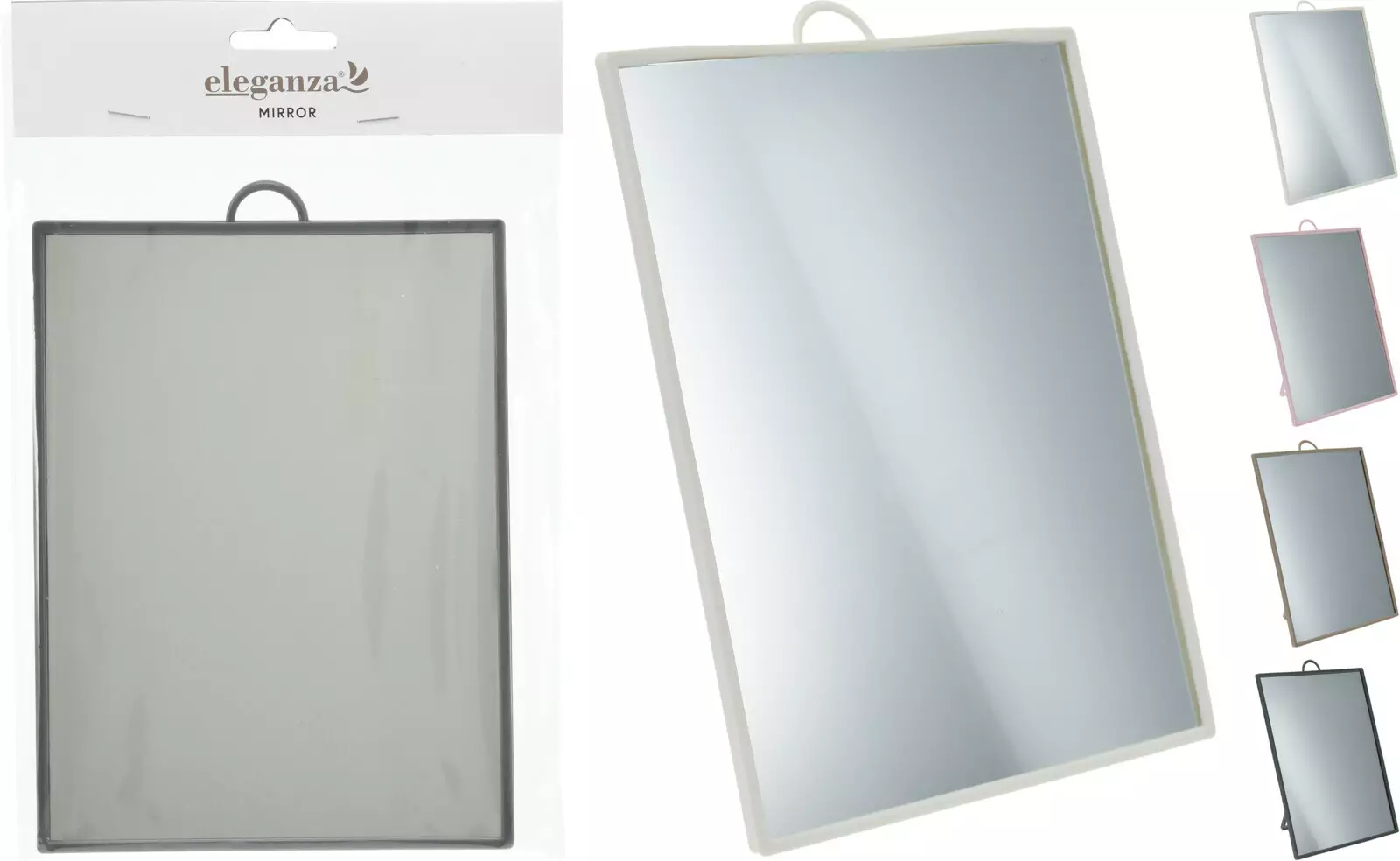 - lätt spegel med plastram - storlek: 145x195 mm - bakstöd som håller stativet upprätt t.ex. på bordet - utrustad med hängkrok - spegeln finns i flera färger (se bild), färg väljs slumpmässigt beroende på lagersaldo (sortimentsprodukt)