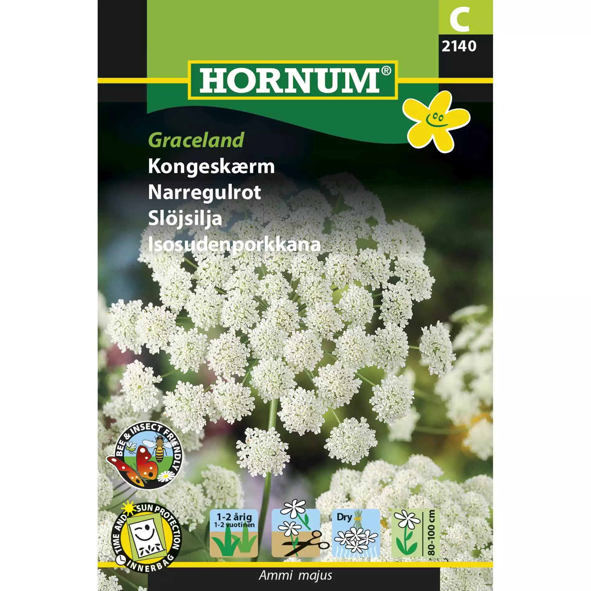 En pålitlig följeslagare för cosmos, dahlia, solros, daglilja med flera bladprydnader och mycket mer!Vargosmorot, eller ammi, växer en stark stam och dekorativa, fina flikiga blad. Den knoppiga blomklustern i juli är dekorativ och håller länge när den blommar.Blomklusterets diameter är 10-20 cm. Hållbar som snittblomma, vacker i olika bindningsarbeten.Växtens höjd är 80-100 cm. Kräver förkultivering.
