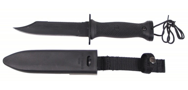 Kopia av US Navy Seal MK 3 kniven. - 14,5 cm lång blad med en icke-reflekterande beläggning- bladets baksida har tandad kant- med plastslida- total längd: 27 cm