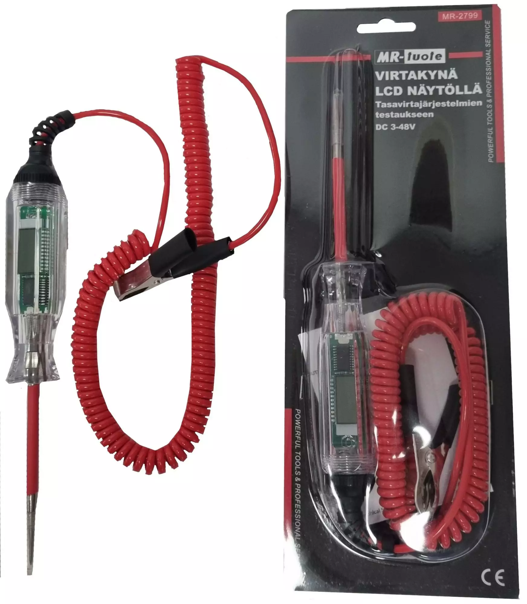 - bakgrundsbelyst LCD-skärm - kabel utsträckt ca 3 m - lång sensor för användning i trånga utrymmen - skarp mätspets i rostfritt stål - spänning DC 3 - 48 V - 3 - 20 V / 17 mA / 20 - 48 V / 10 mA - för positiv och negativ elektrisk laddning - kontrollera t.ex. strålkastare, bakljus, blinkers, felaktiga anslutningar, säkringar, bilbatterier etc.