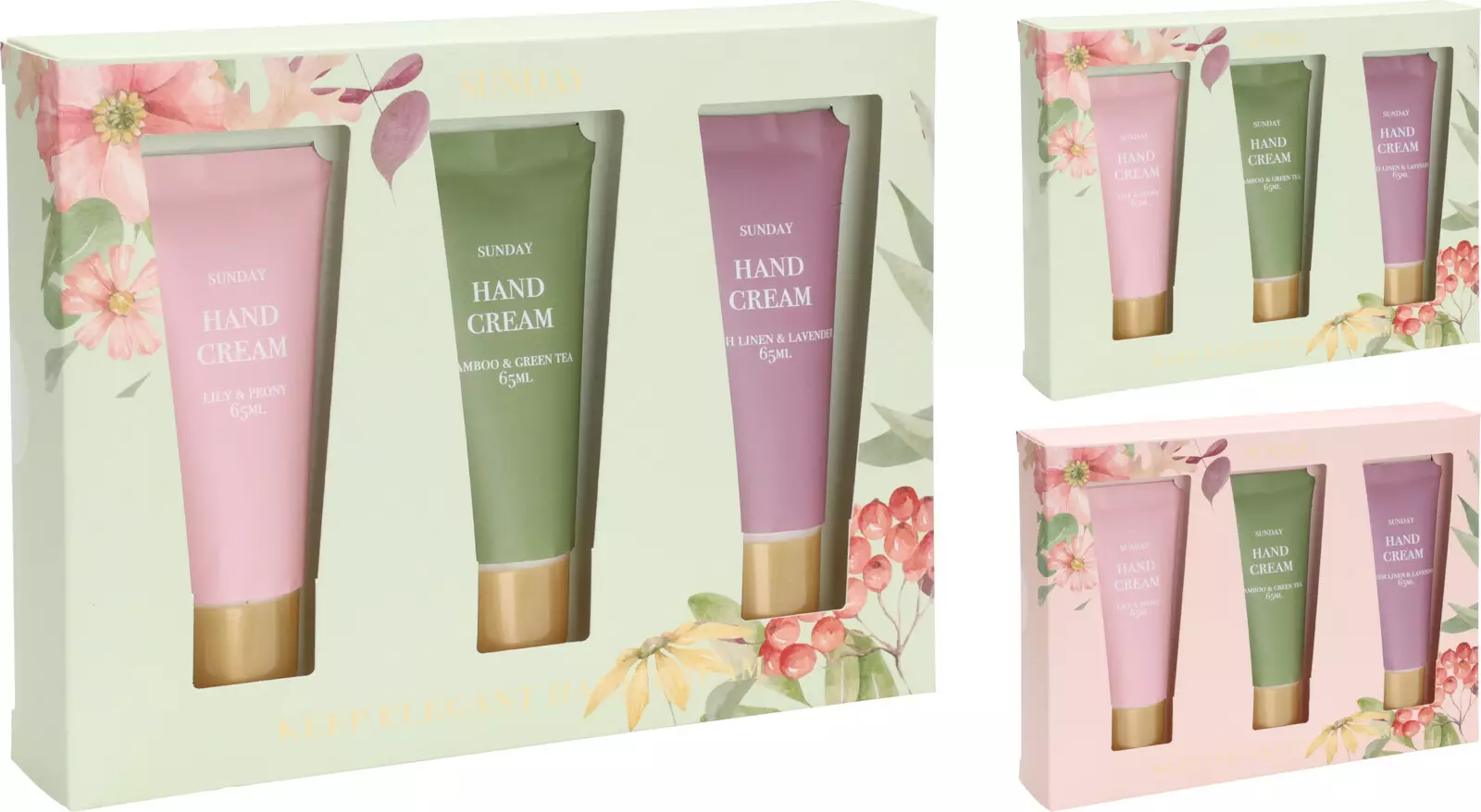 - vackra förpackningar med 3 olika dofter av handkrämsrör - varje rör innehåller 65 ml - dofter: Lily & Peony, Bamboo & Green Tea, Fresh Linen & Lavender - finns i 2 olika färger (se bild) och när du beställer får du slumpmässigt en av dem (blandad produkt)