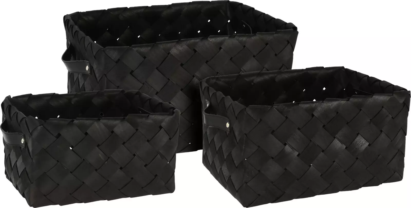 - svarta korgar med läderhandtag Finns i 3 storlekar: * liten 29x29x14 cm * medelstor 33x24x16,5 cm * stor 37x29x19 cm