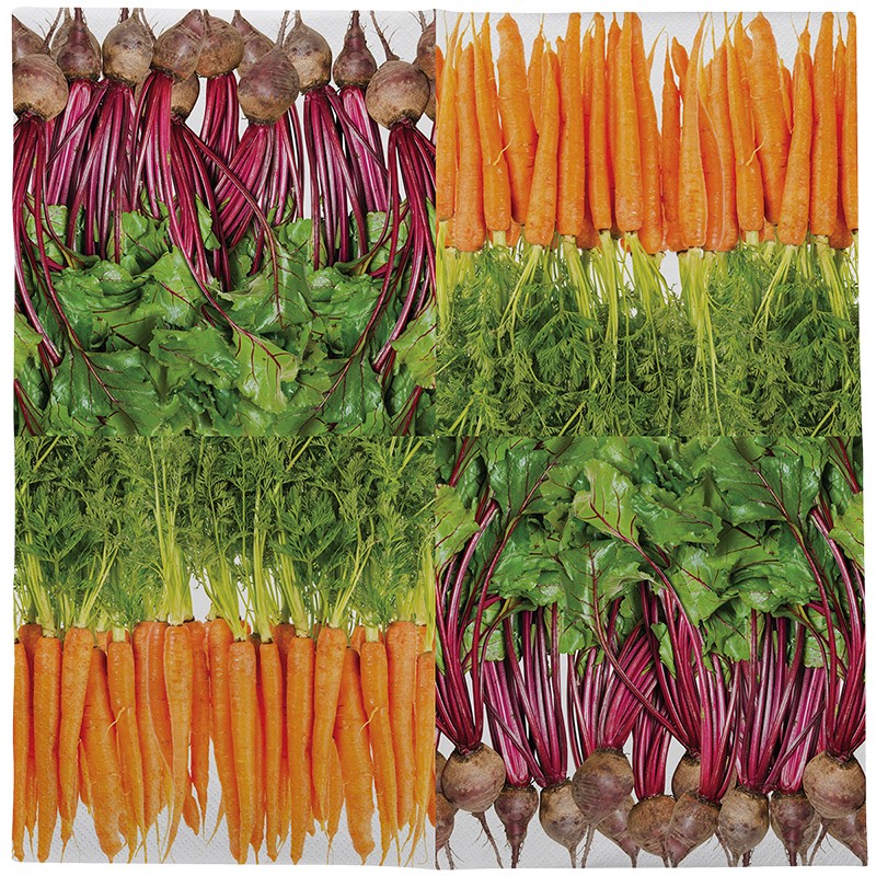 - servetter med grönsaksmotiv - 3-lager - storlek 33x33 cm - förpackningen innehåller 12 servetter - helt utfälld servett har 4 sektioner (med två morötter och två rödbetor) - servetten kan vikas så att antingen morotssidan eller rödbetssidan syns