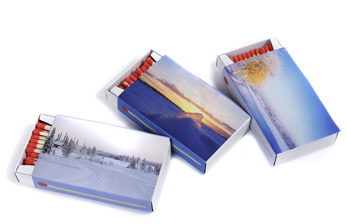 Vacker vintertematik tändsticksask - paket med 3 olika askar - varje ask innehåller 50 stickor, totalt i paketet 150 - längd på stickorna 100 mm