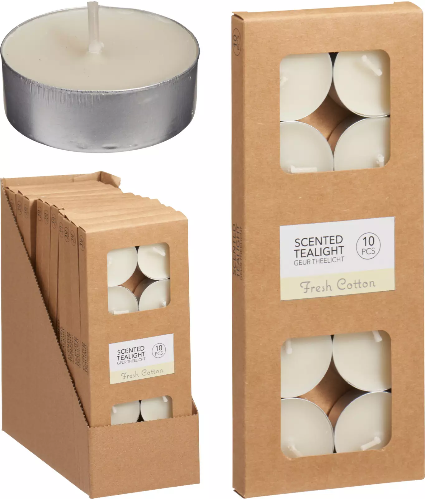 Mildt doftande traditionella storlekar på små tealights i aluminiumkoppar- doft av Fresh Cotton- förpackning av brunt kartong- 10 st/pack