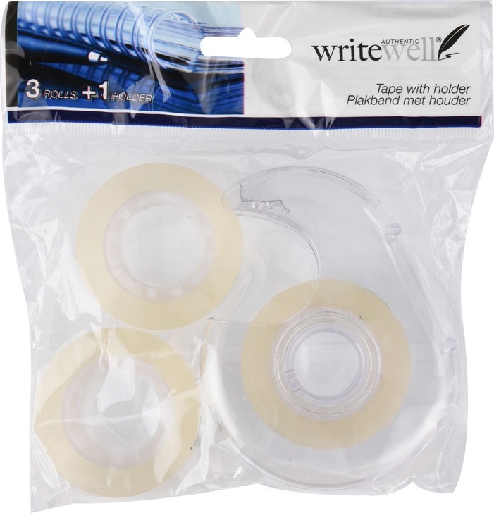 förpackningen innehåller 3 rullar klart tejp samt en hållare med brytskär