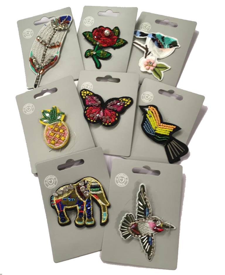 Ett tygbaserat färgglatt brosch med pärlprydnader och säkerhetsnålfäste. Storlekar varierar: ananas 3,5x5,5 cm - fjäder 4x12 cm