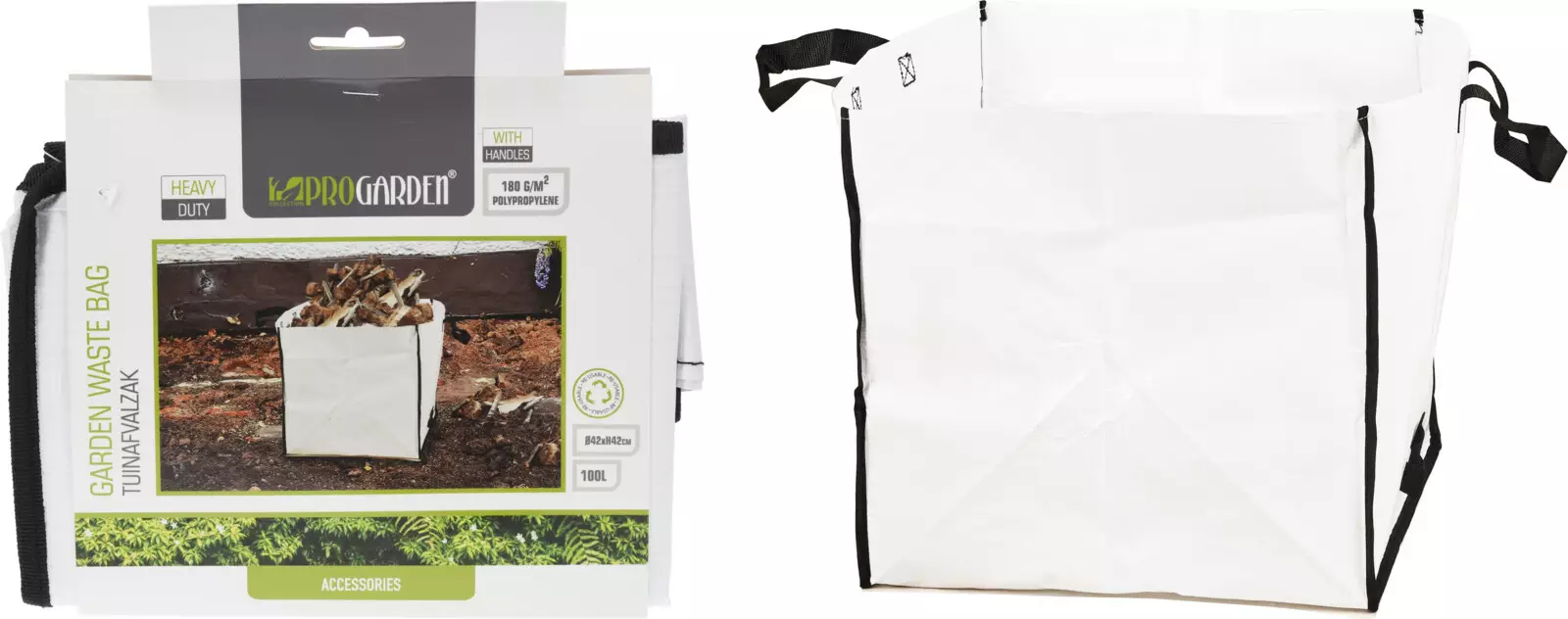 Vit påse med svarta förstärkningar och bärhandtag - exempelvis för transport av trädgårdsavfall - 180 g/m2 stark polypropylene - volym 100 liter - mått: 42x42 cm - höjd 42 cm