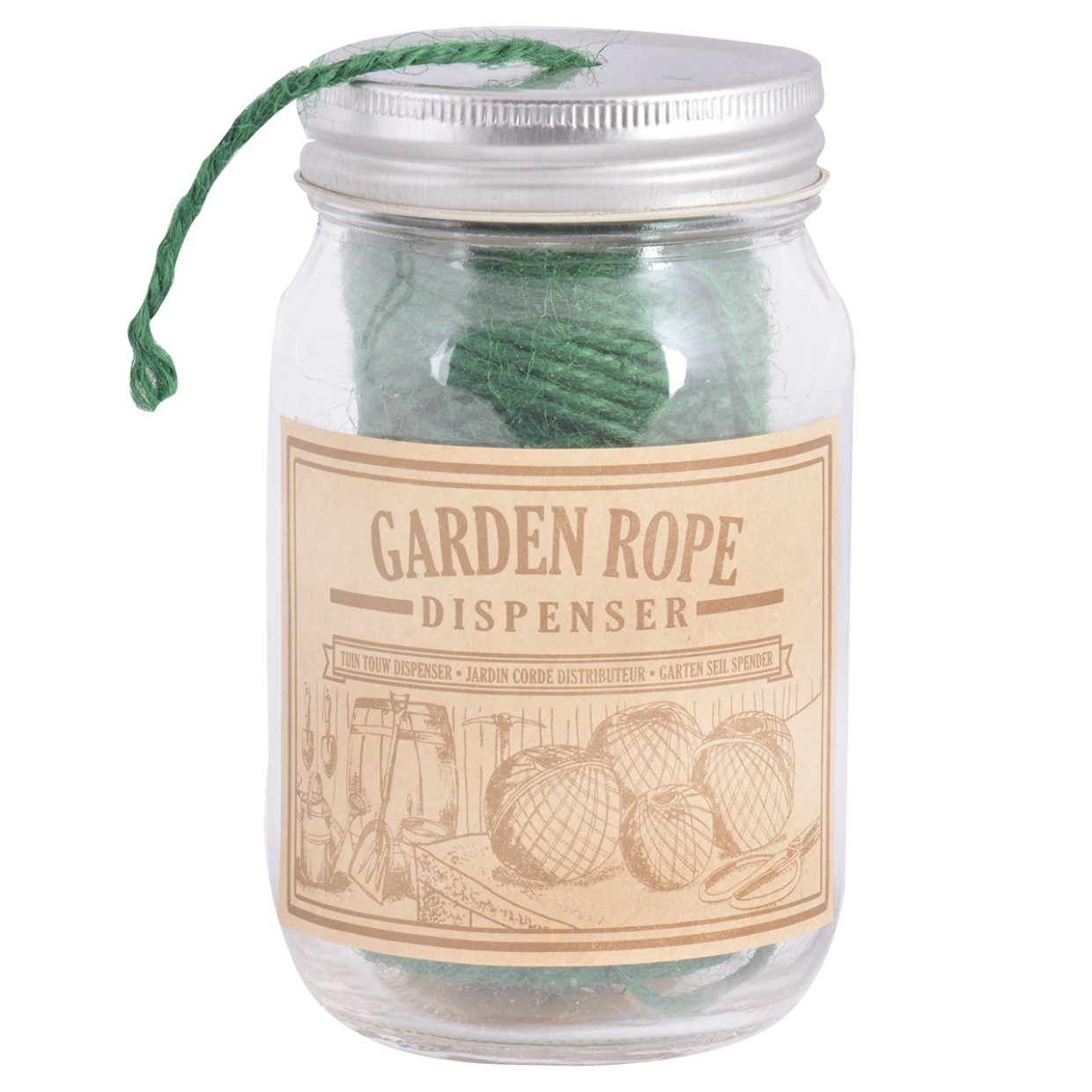 Burkar används inte bara i köket, utan de kan också användas för att organisera små verktyg eller trädgårdsredskap. Med denna klara glasburk ser du enkelt vad som finns inuti, och den kommer också med en vintage-tryckt etikett. Det gröna jute-snöret kan användas för att hänga upp växter och buskar på ett naturligt sätt. Detta robusta, 100% naturliga, väderbeständiga snöre är cirka 102 meter långt. Glasburken säkerställer att snöret inte trasslar sig och är lätt att ta bort tack vare öppningen på burklocket. - burkens mått: 8x13,4 cm - vikt cirka 300 g