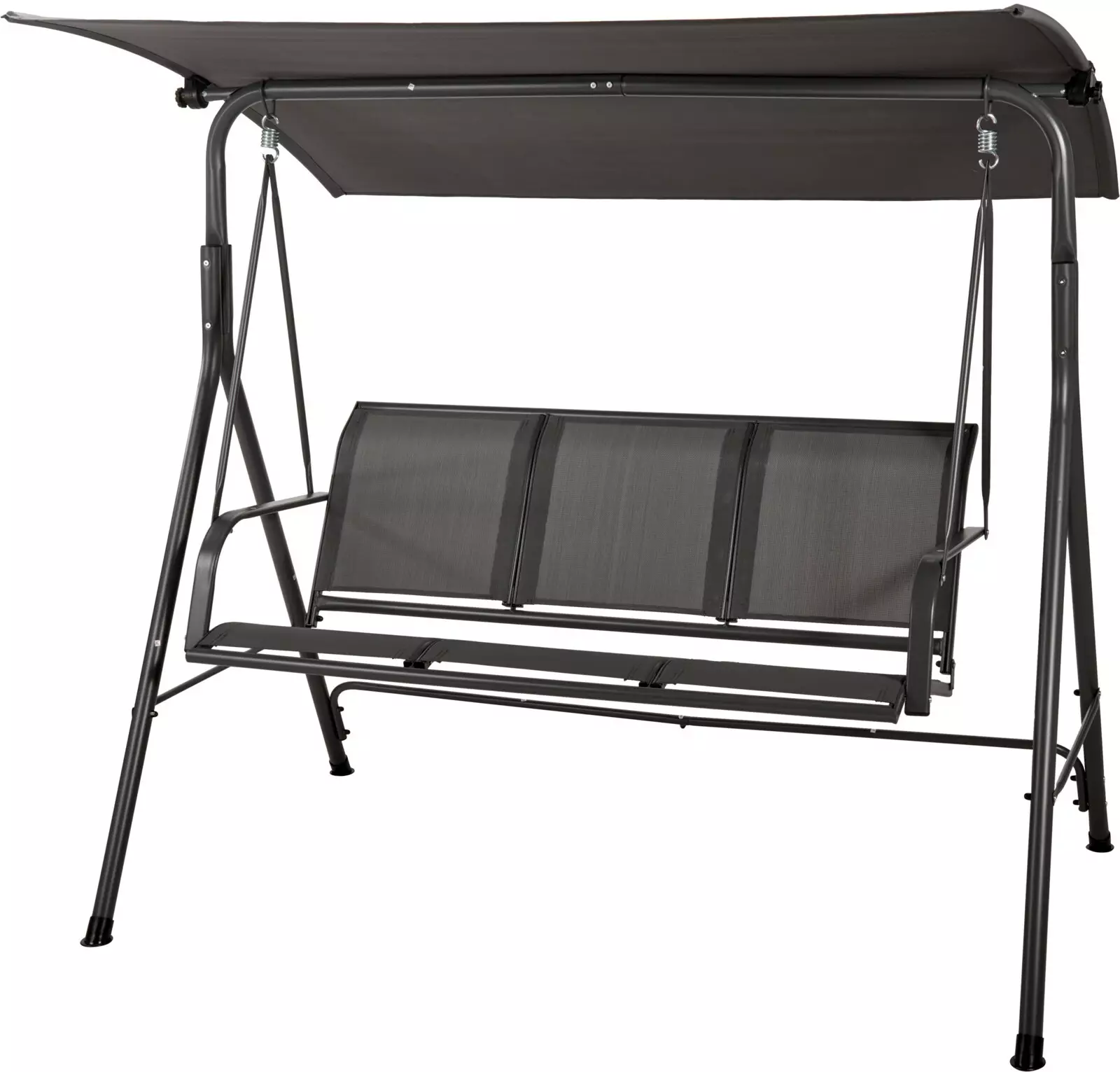 Trädgårdssoffa för tre personer med armstöd och tak- färg antracitgrå- ram i pulverlackerad stål- sits och ryggstöd av väderbeständigt polyester med en vikt av 160 g/m²- fästen av lätt och hållbart polypropen- maximal belastning 300 kg- djup 70 cm- bredd 111 cm- höjd 153 cm- vikt 21,5 kg