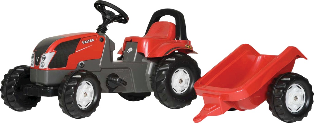 RollyKid-seriens Valtra tramptraktor med släpvagn, öppningsbar motorhuv, säkerhetsbåge och justerbar kedjespänning. - rekommenderad ålder: 2,5-5 år- mått (l x b x h): 134 x 47 x 52 cm- vikt: 8 kg