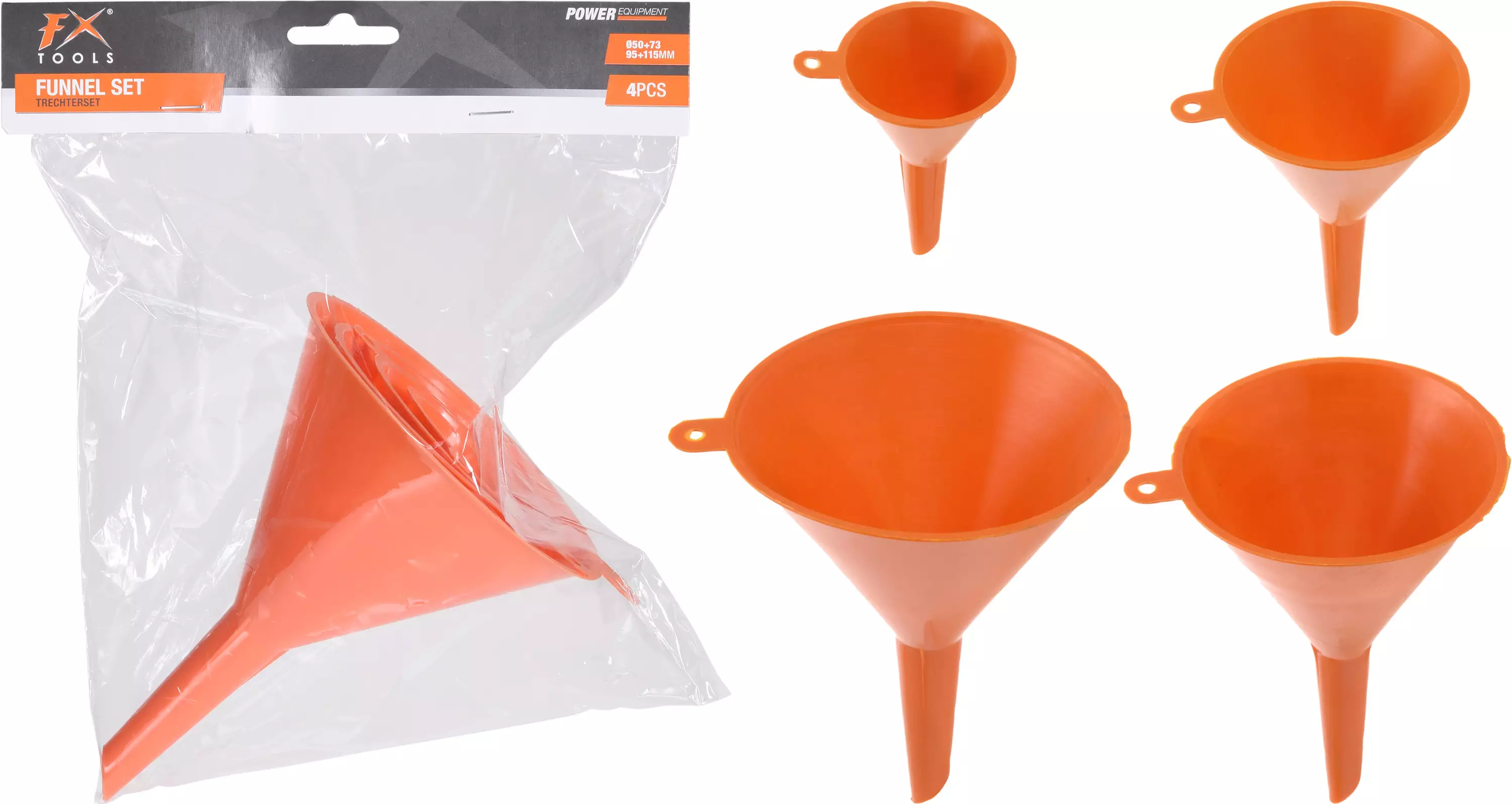 4-delad trattset för allmän användning. Trattarnas diametrar: 50, 73, 95 och 115 mm.