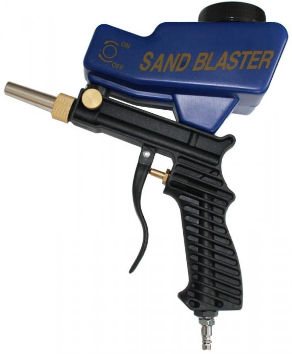 Kompakt, bärbar och lätt att hantera!Lämplig för bland annat sand, sodablästring, glasperlor, aluminiumsilikat.- Kornstorlek 46 - 100- Behållarvolym 600 ml- Ståldys, Ø 5 mm, utbytbar- Arbetstryck 5 - 10 bar- Luftförbrukning 198 l/min- Luftkoppling 1/4 "- Material ABS- Vikt ca 1000 gTar enkelt bort rost, färg, smuts och oxider.Lämplig även för etsning av speglar/glas. Tillbehör som finns att köpa:MR-2287 Utbytbar dyse för blåspistolen, diameter 5 mm