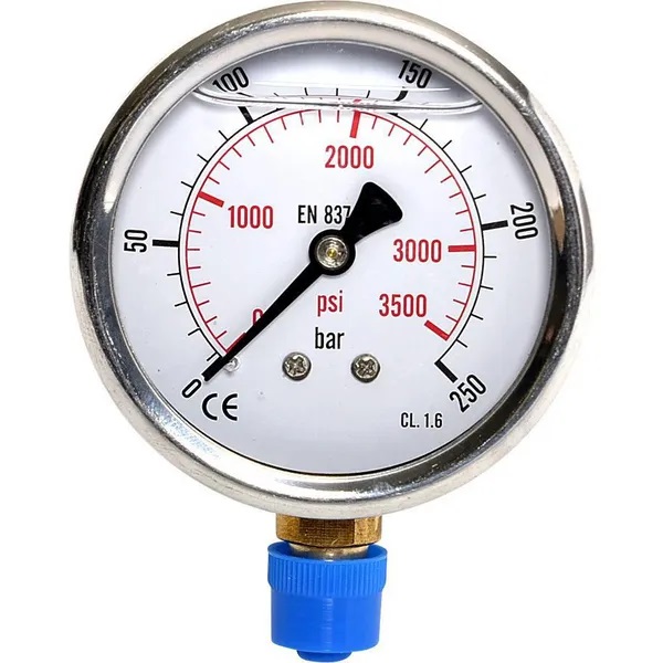 Analogtryckmätare med rostfritt hölje. Tryckmätaren har glycerindämpning och 1/4" anslutning. - tryck: 0-250 bar - utvändig diameter: 63 mm