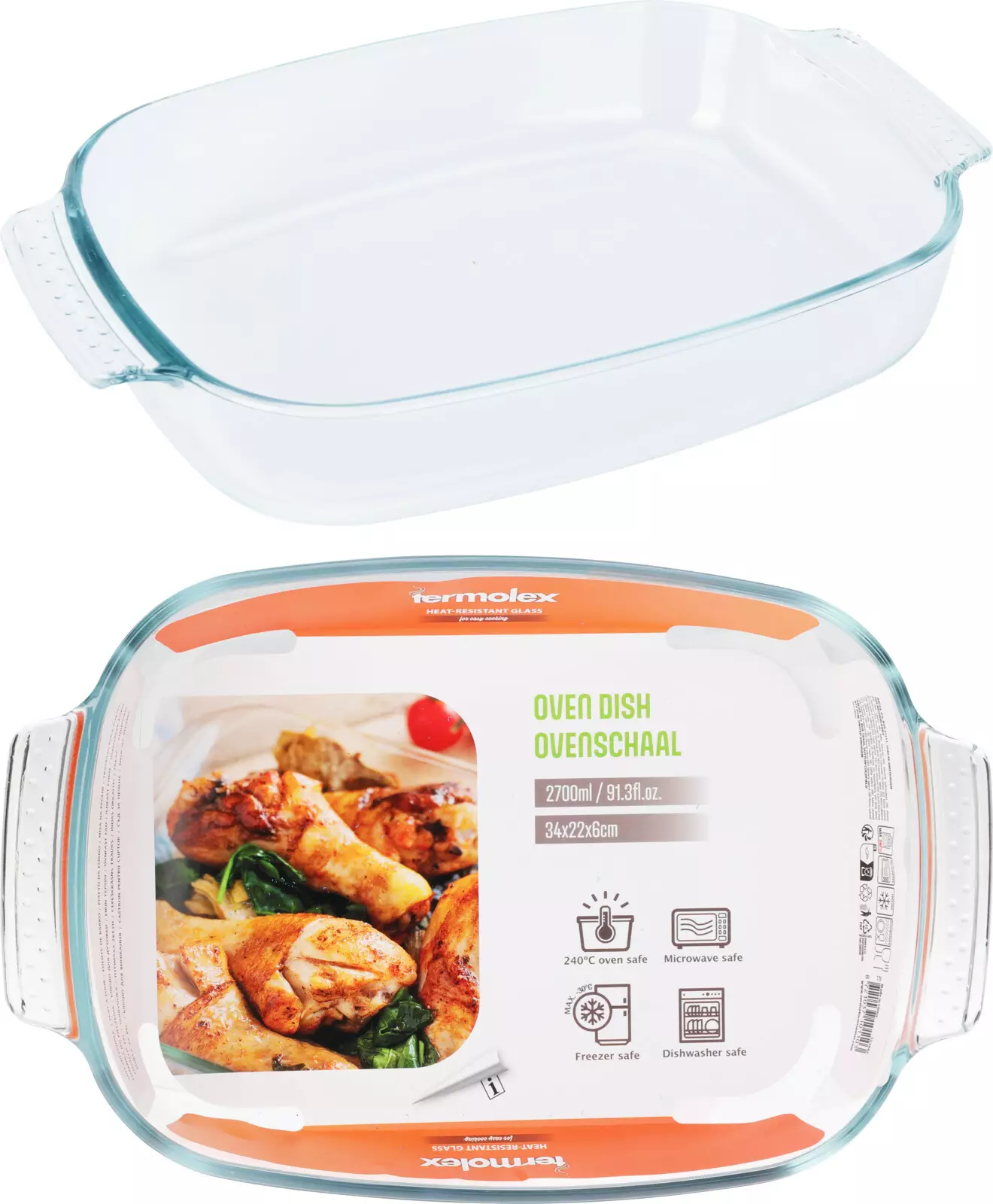 Glas ugnsform - volym 2700 ml - mått 34 x 22 x 6 cm - tål frys, diskmaskin och mikrovågsugn - paket innehåller 1 ugnsform