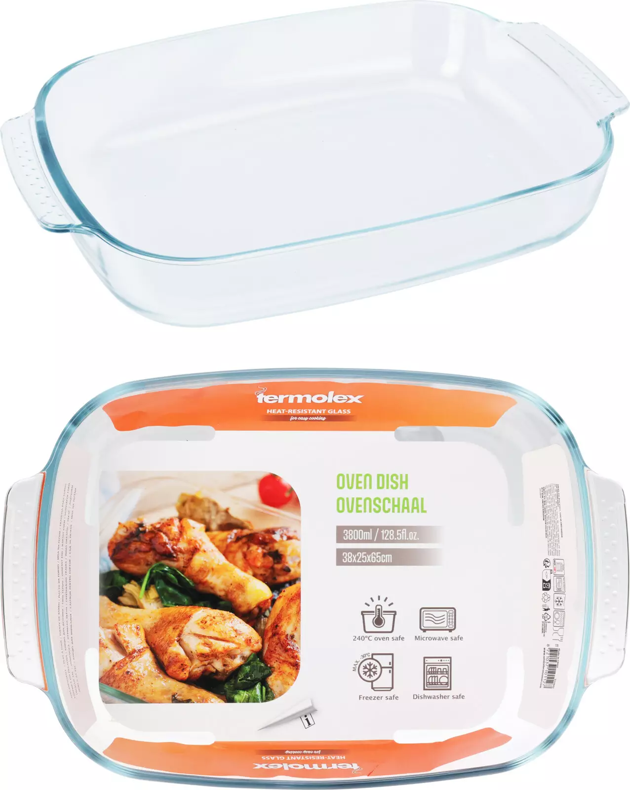 Ugnsform i tjockt glas - volym 3800 ml - mått 39 x 25 cm (från ovankant, med handtag) / 31 x 24 cm (botten) - tål både ugn, frys, diskmaskin och mikrovågsugn