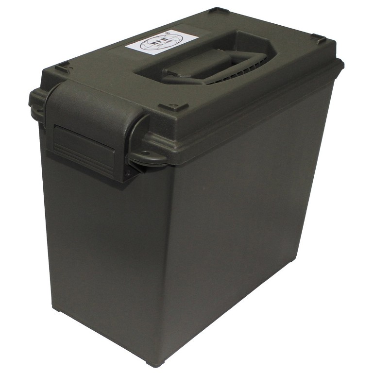 En vattentät ammunitionlåda av nyproduktion i enlighet med den amerikanska arméns modell, tillverkad av slagbeständig plast. Den är mångsidig och hållbar, och kan användas för förvaring och transport av mer än bara ammunition! - färg: olivgrön- med två spännlås- hål för två hänglås- med vikbart handtag- mått: 37 x 21 x 33 cm