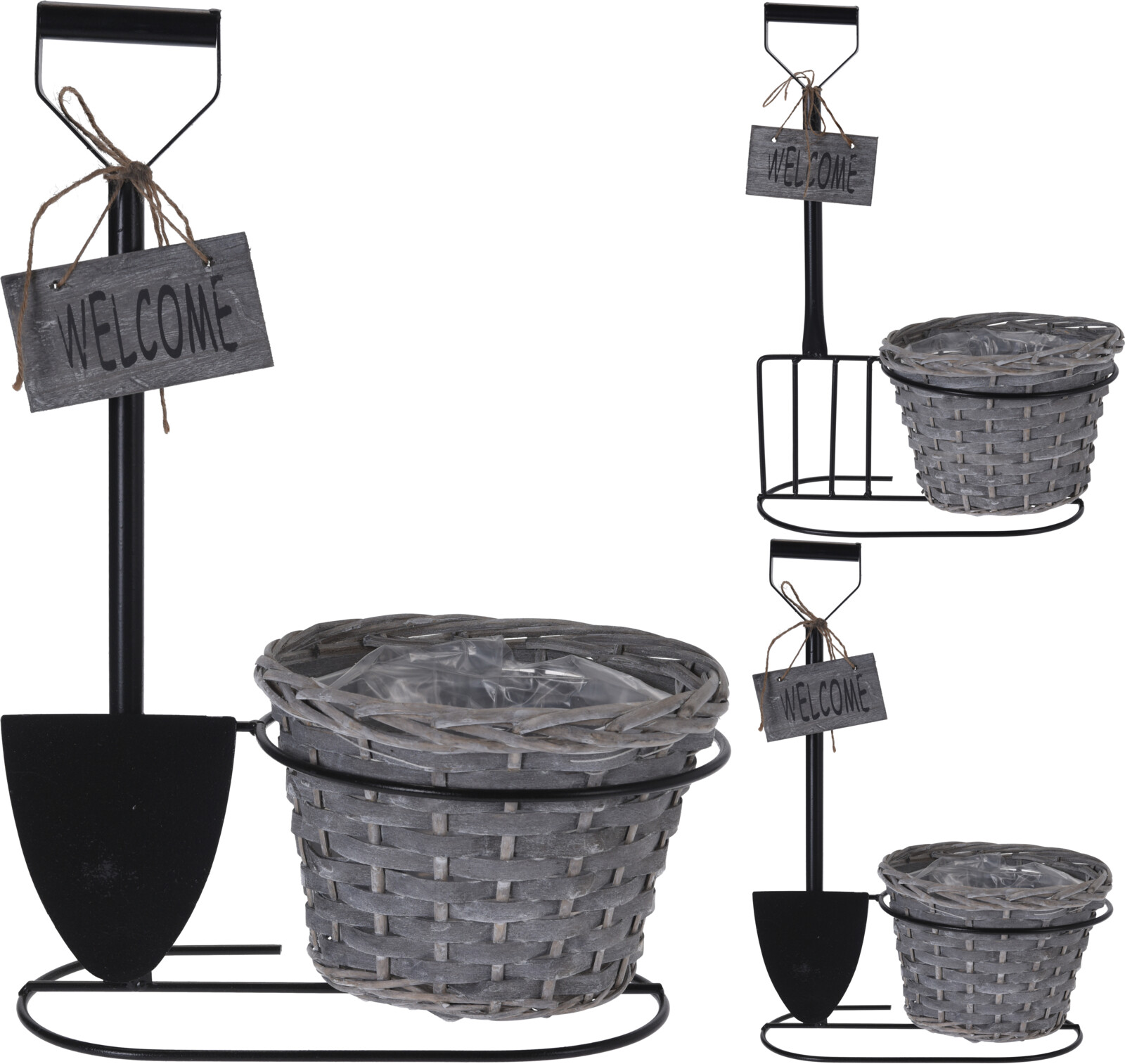 - liten grå korg på svart metallställ - bordmodell, kan också användas på marken - lättviktig konstruktion - utrustad med Välkommen-skylt - finns i 2 motiv: grep och spade, vid beställning får du slumpmässigt en av dem (sortimentsprodukt) - höjd 44 cm - bredd 30 cm