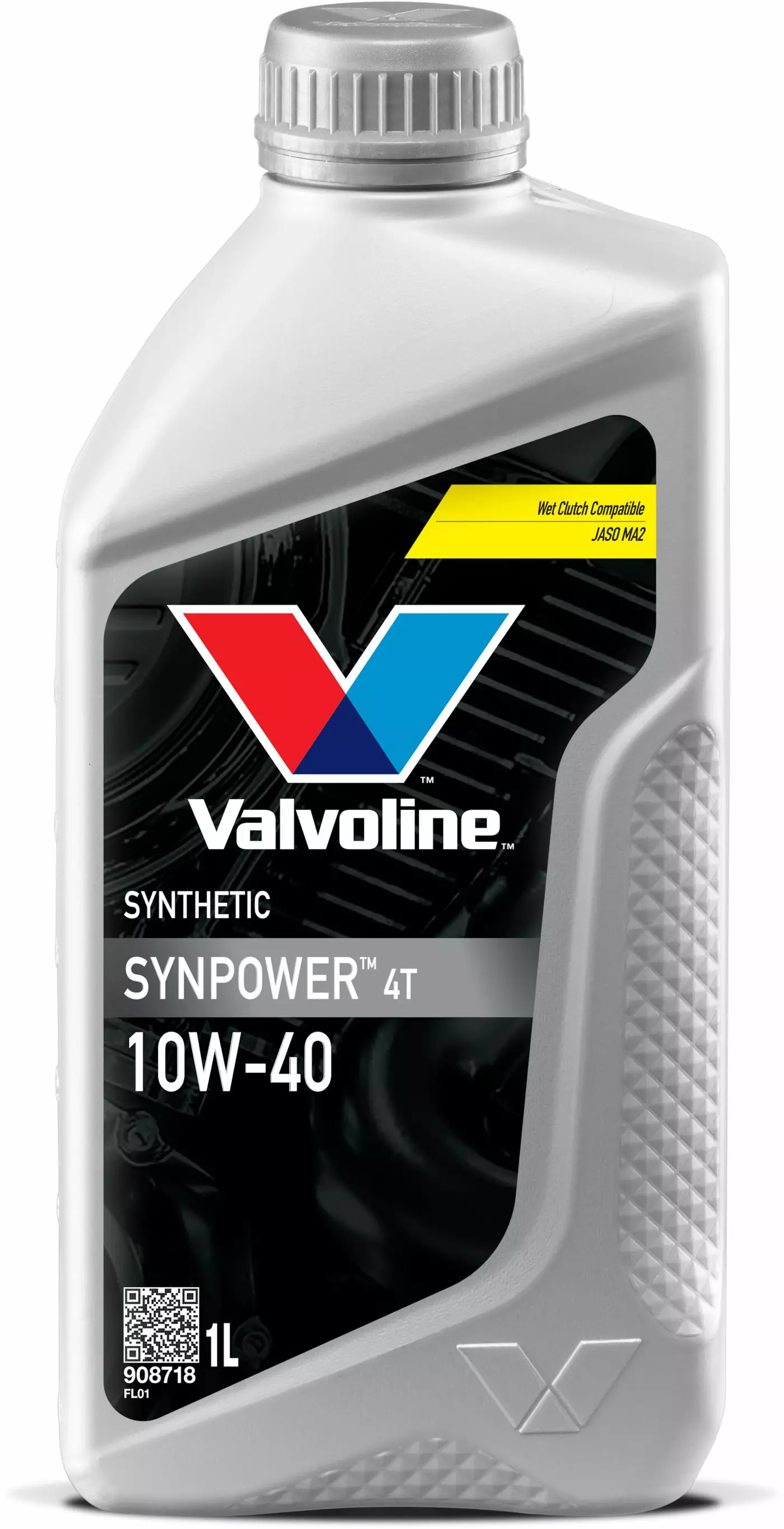 Valvoline Synpower 4T är en helsyntetisk, prestandaorienterad motorolja för fyrtaktsmotorcyklar. Den är avsedd för användning i fyrtaktsmotorer som rekommenderar API SN SAE 10W-40. Oljan kan användas i högpresterande motorcyklar och är speciellt utvecklad för motorstrukturer i "våt sump" fyrtaktsmotorcyklar där vevhuset också fungerar som oljetank. Oljan har optimala friktionsegenskaper som möjliggör maximal effektivitet, smidiga växlingar och korrekt skydd för våtkopplingar. Oljan skyddar effektivt mot slitage och uppbyggnad av föroreningar, med utmärkta smörjegenskaper både i kallt och varmt väder. Den möjliggör snabb start även under mycket kalla förhållanden eller efter långa perioder utan användning. - viskositet: SAE 10W-40; 94 mm²/s (40 °C), 13,9 mm²/s (100 °C)- viskositet-index: 150- flödpunkt: -39 °C- flammepunkt: 226 °C- API-godkännande: SN- prestanda: JASO MA, MA2
