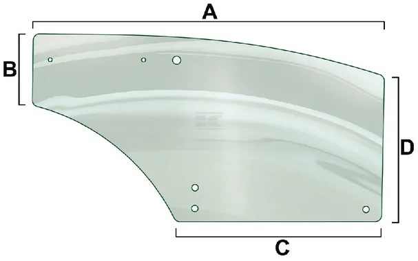 Glas till vänster dörr på traktorn. - längd A: 1 450 mm - längd B: 290 mm - längd C: 835 mm - längd D: 595 mm - tjocklek: 6 mm - motsvarar del: John Deere R198624 Passar följande John Deere modeller: - 5065M - 5070M - 5075M - 5080M - 5080R - 5080RN - 5083E - 5085E - 5085M - 5090M - 5090R - 5090RN - 5093E - 5095M - 5100E - 5100M - 5100R - 5100RN - 5101E - 5105M - 5220 - 5225 - 5320 - 5325 - 5420 - 5425 - 5520 - 5525 - 5603 - 5620 - 5625 - 5720 - 5725 - 5820 - 6100D - 6110D - 6115D - 6125D - 6130D - 6140D - 6403 - 6603