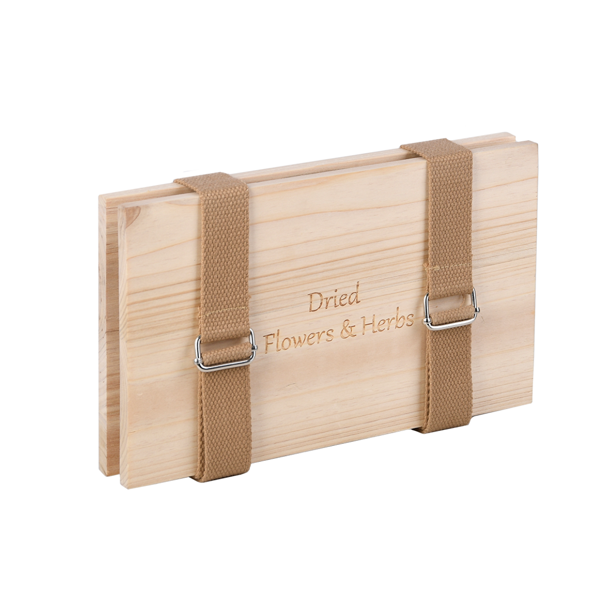 Traditionell träväxtpress för att torka tunna växter till ditt eget herbarium, kortstillverkning etc. - Spänning med tygremmar - Vacker brännmärkt text: "Torkade Blommor & Örter" - Mått: 16 x 25 x 24 cm