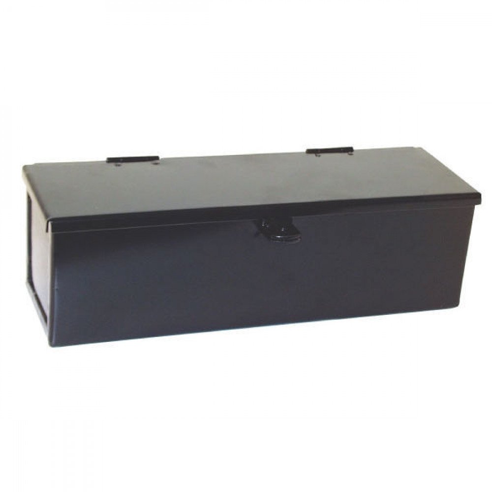 Svart verktygslåda i stål, exempelvis för en arbetsmaskins hytt. Kan låsas med hänglås. Finns i två olika storlekar. Storlek 40 cm: Yttre bredd 400 mm Yttre höjd 120 mm Yttre djup 120 mm Storlek 50 cm: Yttre bredd: 500 mm Yttre höjd: 140 mm Yttre djup: 140 mm