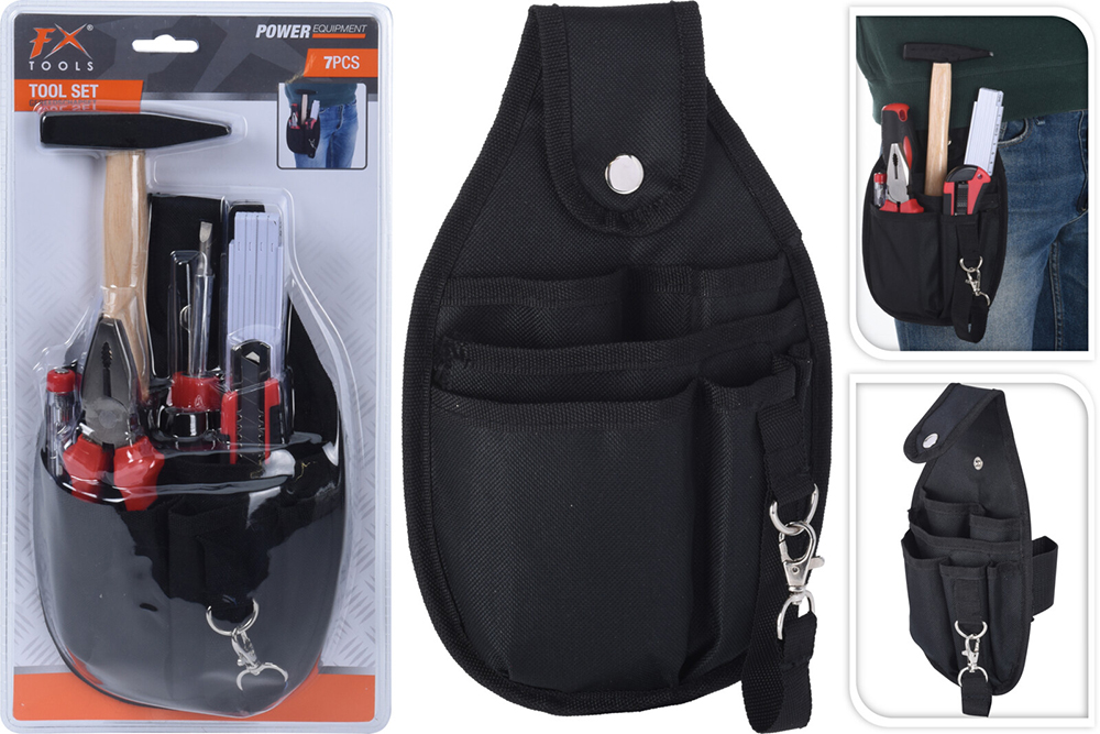 - praktisk hölster för verktyg och tillbehör som kan hängas i bältet - knäppfäste - material: nylon - inkluderar grundläggande verktyg: hammare, måttband, tång, mattkniv och 2 skruvmejslar