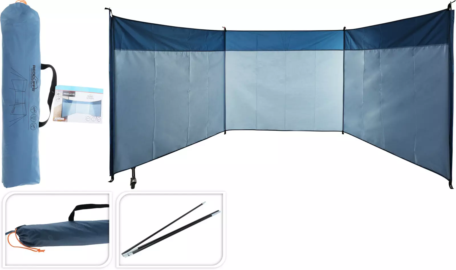 Vindskydd runt campingplatsen - mått ihopfälld 500 x 140 cm - kan sättas upp som en rak eller vinklad vägg - packad i en skyddspåse med mått 55 x 12 cm - monteras snabbt med fyra pop-up-stil tältstänger - inkluderar 10 markpinnar och 6 orange fästsnören - material som är vatten- och smutsavvisande polyester